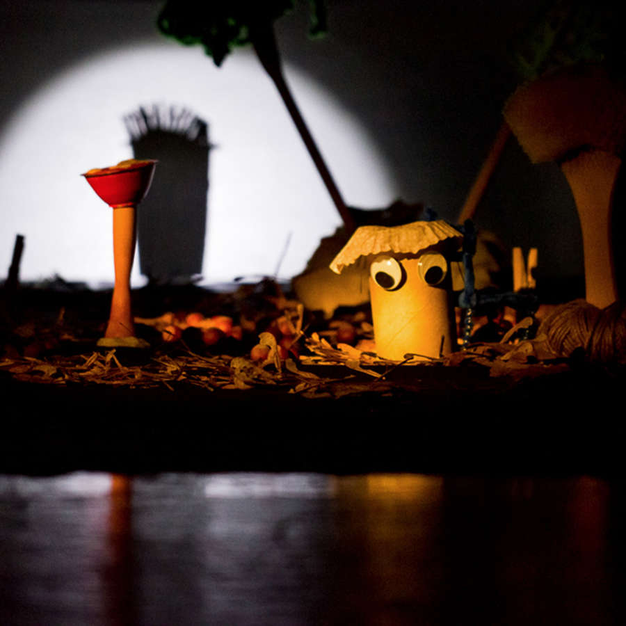 „Die Welt ist rund“ erzählt die Geschichte der kleinen Rose, die sich auf den Weg macht die Welt zu begreifen. Rose hat viele Fragen, aber noch mehr Antworten. Sie hat einen Hut, einen Freund und einen Plan: mit Hut aber ohne Freund! Allein will sie mit ihrem blauen Gartenstuhl auf der Spitze eines Berges sitzen. Mit alltäglichen Objekten wie Gläsern, Dosen, Papierrollen, Tüchern und Wunderkerzen tauchen wir ein in die (Gedanken-)Welt der kleinen Rose.